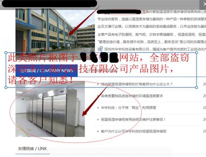 深圳市華宇現(xiàn)代科技有限公司擁有一項恒溫恒濕存儲柜國家發(fā)明專利,和多項相關(guān)的結(jié)構(gòu)新型及軟著專利。產(chǎn)品廣泛用于外資企業(yè),大企業(yè),企業(yè)集團,軍工,醫(yī)藥,博物館,檔案館。最近發(fā)現(xiàn)市面有很多貿(mào)易公司或五金生產(chǎn)廠家,在線下或網(wǎng)絡(luò)上盜用我司的產(chǎn)品資料及圖片進行不良銷售活動。更有甚者以華宇現(xiàn)代的品牌私下接單,但實際銷售的產(chǎn)品卻是不具備恒溫恒濕功能的非我司產(chǎn)品?。ɡ绾蜕钲谑腥A宇現(xiàn)代科技有限公司相似名稱來取名以混淆客戶,更有甚者,其網(wǎng)上全部圖片盜用華宇現(xiàn)代產(chǎn)品圖片,以蒙騙客戶(可以進入華宇現(xiàn)代官網(wǎng)www.dianzixianshu.cn比較即知))